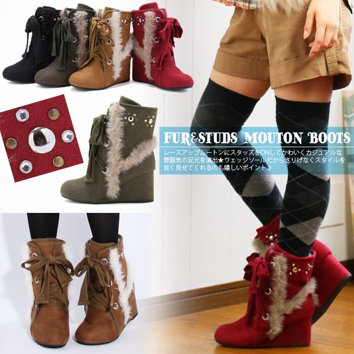 送料無料 ブラウン茶Lファーリボンヒール付あったかミドルムートンブーツです♪